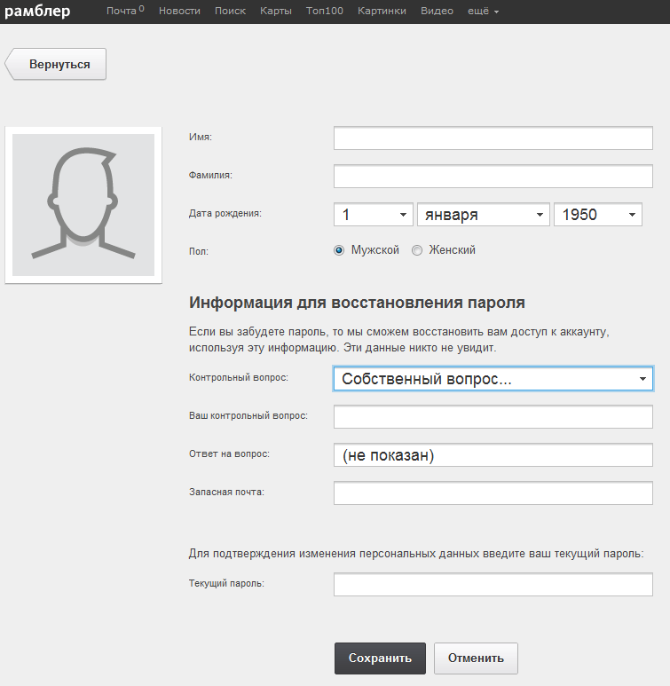 6. Укажите "запасной" почтовый ящик. Введите пароль, чтобы подтвердить изменения.